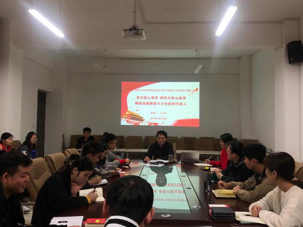 10月16日,党委书记王文华在社科楼412会议室为学生支部上了“牢记初心使命 讲好大别山故事 做担当民族复兴大任的时代新人”主题党课。参加人员为德赢官网研究生、本科生三个学生支部全体党员,入党积极分子及获得国家奖学金、国家励志奖学金品学兼优的同学。王文华在授课中结合习近平总书记在河南考察调研时的重要讲话精神,提出要从大别山革命的历史及精神、大别山精神对我们的启示两方面进行学习。一是从大别山历史精神中学习到以中国共产党人为代表的大别山革命群体始终坚守初心,在革命紧要关头不畏惧、不退缩,团结一心,牺牲自己为全局胜利创造条件表现出的高度奉献精神。二是从大别山精神的启示中学习到在传承红色基因、讲好大别山故事中巩固和升华理想信念,争做担当民族复兴大任的时代新人。