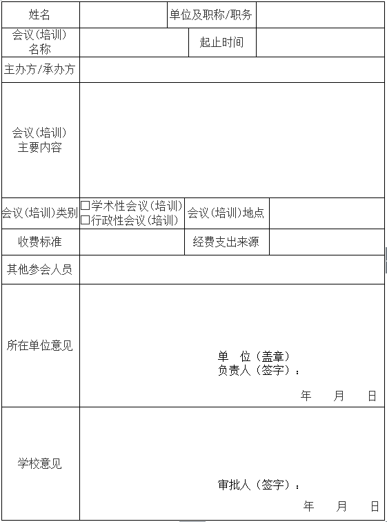 (三)教职工外出,须同时向学院党委书记和院长请假,并向学院分管领导报备,同时填写《德赢vwin体育官网登录教师外出请假审批报备表》(附件1)《信阳师范学院工作人员出差审批单》(附件2)《信阳师范学院教职工外出参加会议(培训)审批表》(附件3),办理手续后报党政办公室。如遇事急需临时外出的,应通过电话、微信等请假,返校后及时补办请假手续。
